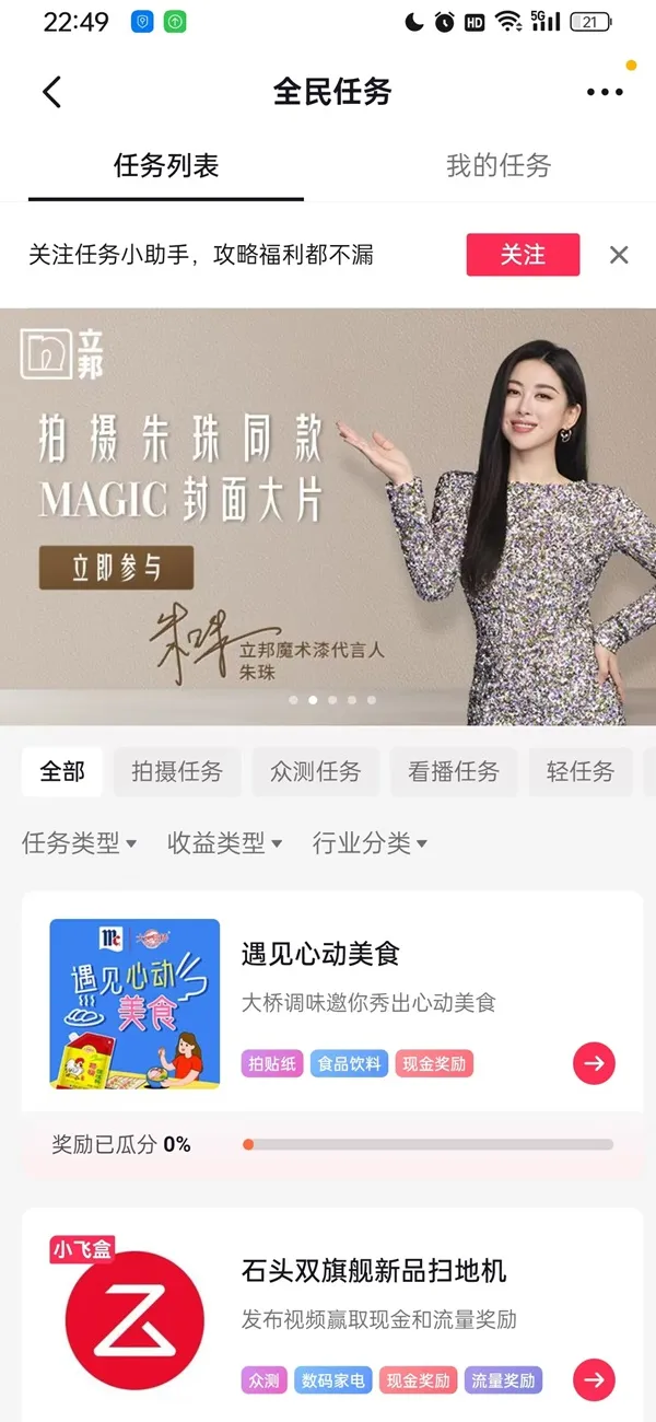 这些任务包括拍摄任务、众测任务、看播任务、轻任务、直播任务和小飞盒等。如下图所示: